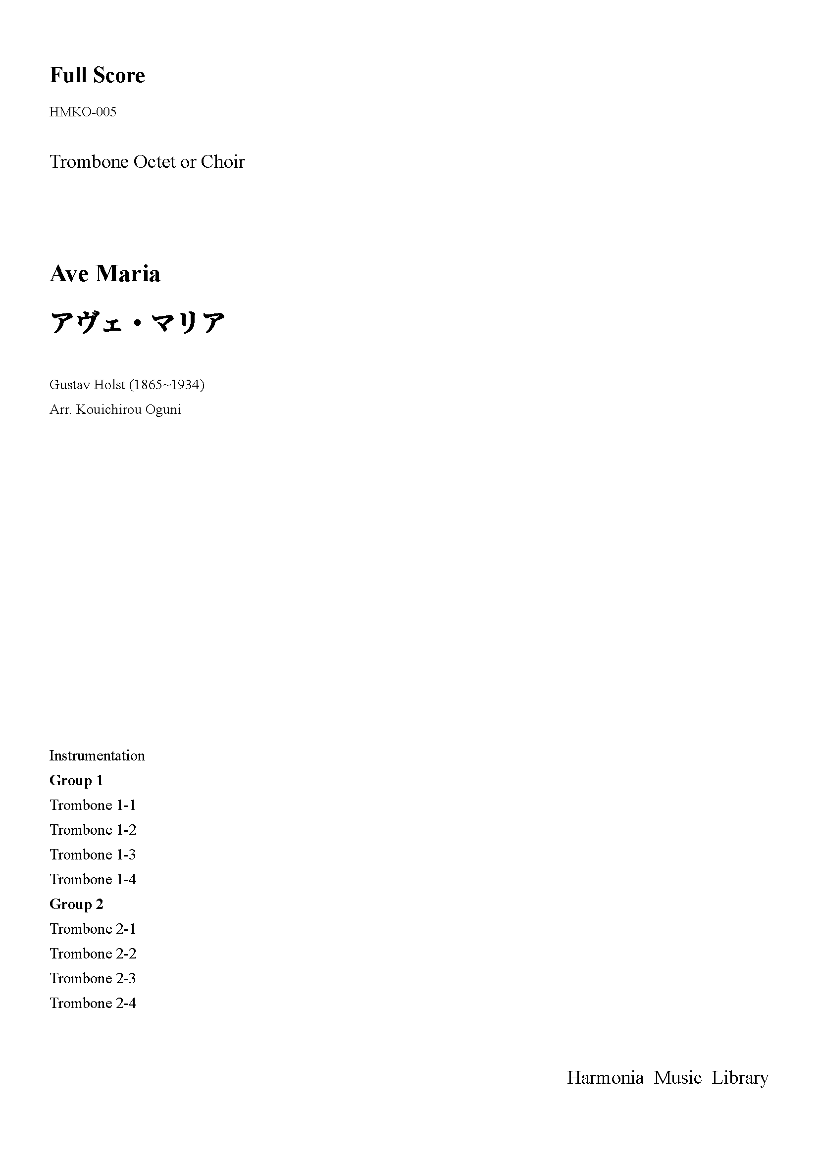 アヴェ・マリア(トロンボーン8重奏またはクワイヤー) PDF Download版 (グスターヴ・ホルスト/小國晃一郎)